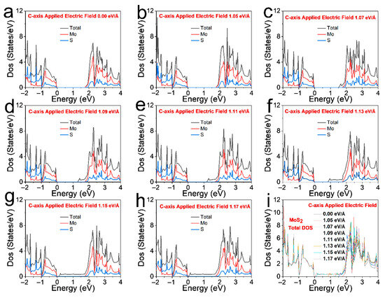 Figure 11h), distinct alterations in the total DOS and the partial DOS of Mo and S are observed. In the absence of an electric field (