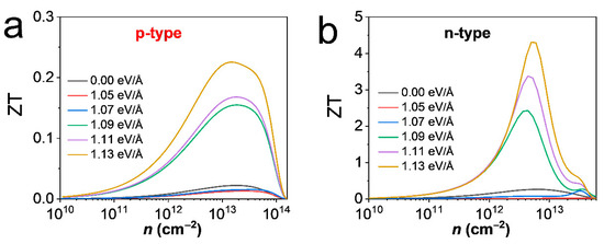 n, reaching a maximum at an optimal carrier concentration, and then declining as n continues to increase. As the electric field applied along the c-axis intensifies (from 0.00 eV/Å to 1.13 eV/Å), the magnitude of these