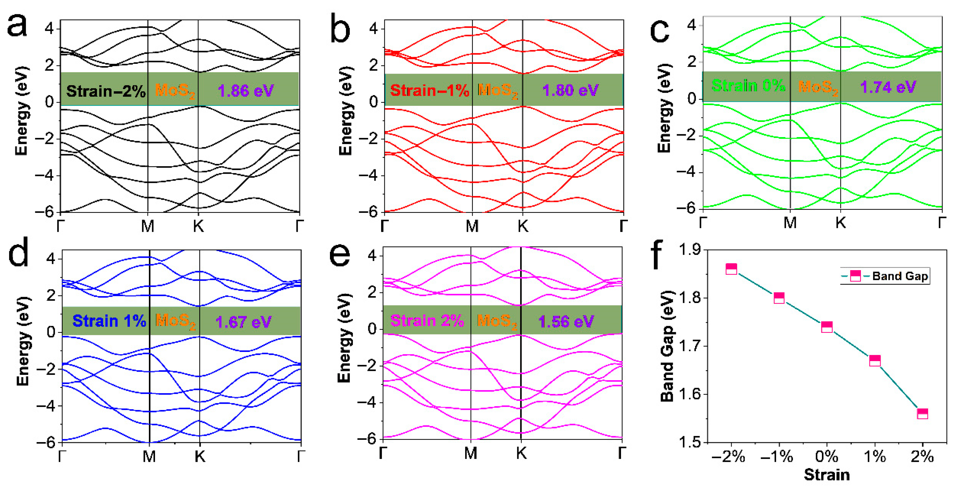 Figure 10g), the band gap is significantly reduced to approximately 0.10 eV. This electric field-induced band gap modulation is closely related to the quantum confinement and Stark effects, which alter the energy levels and orbital interactions within the MoS