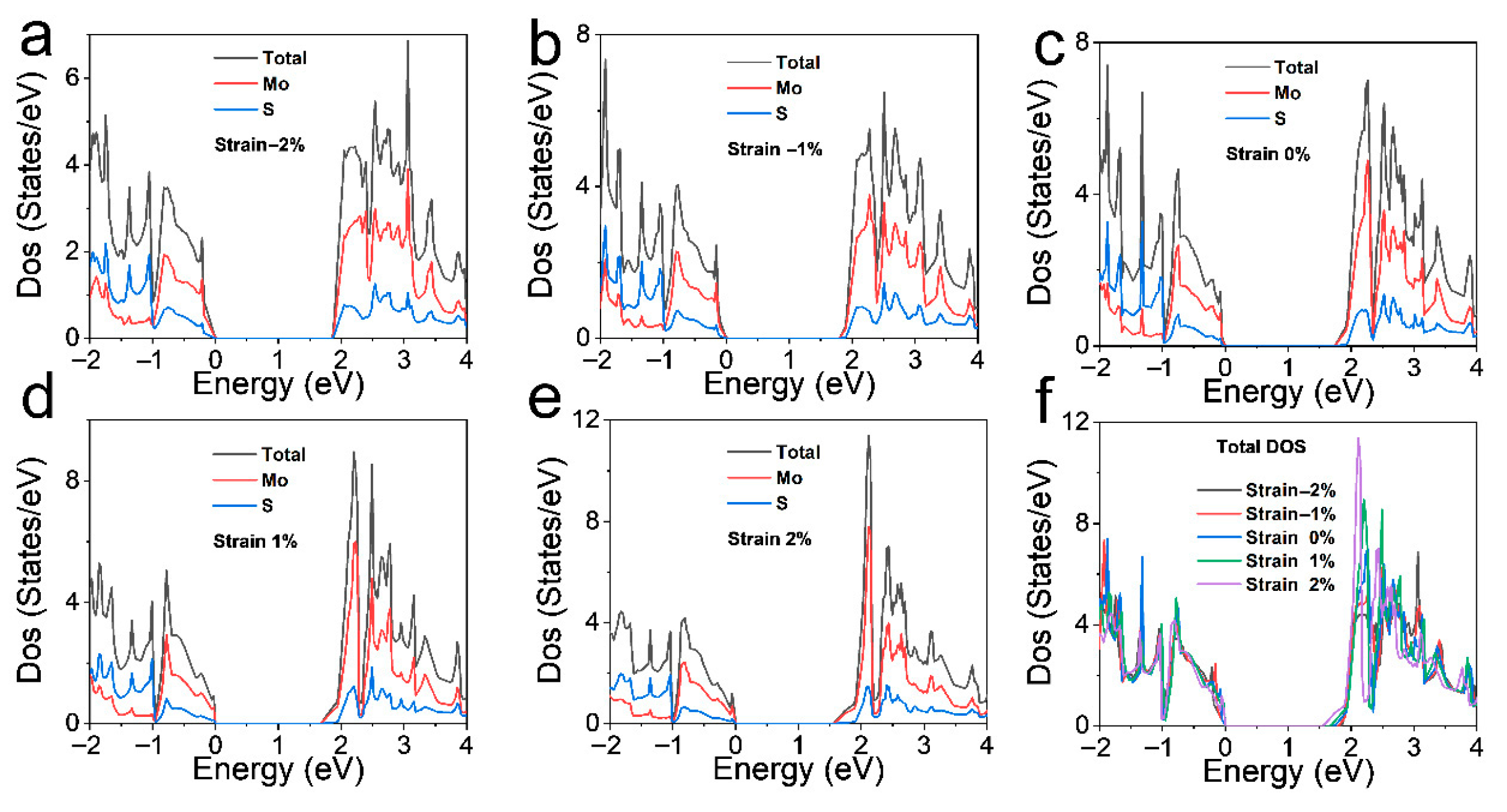 Figure 11a), the DOS features characteristic peaks that align with the intrinsic electronic structure of MoS