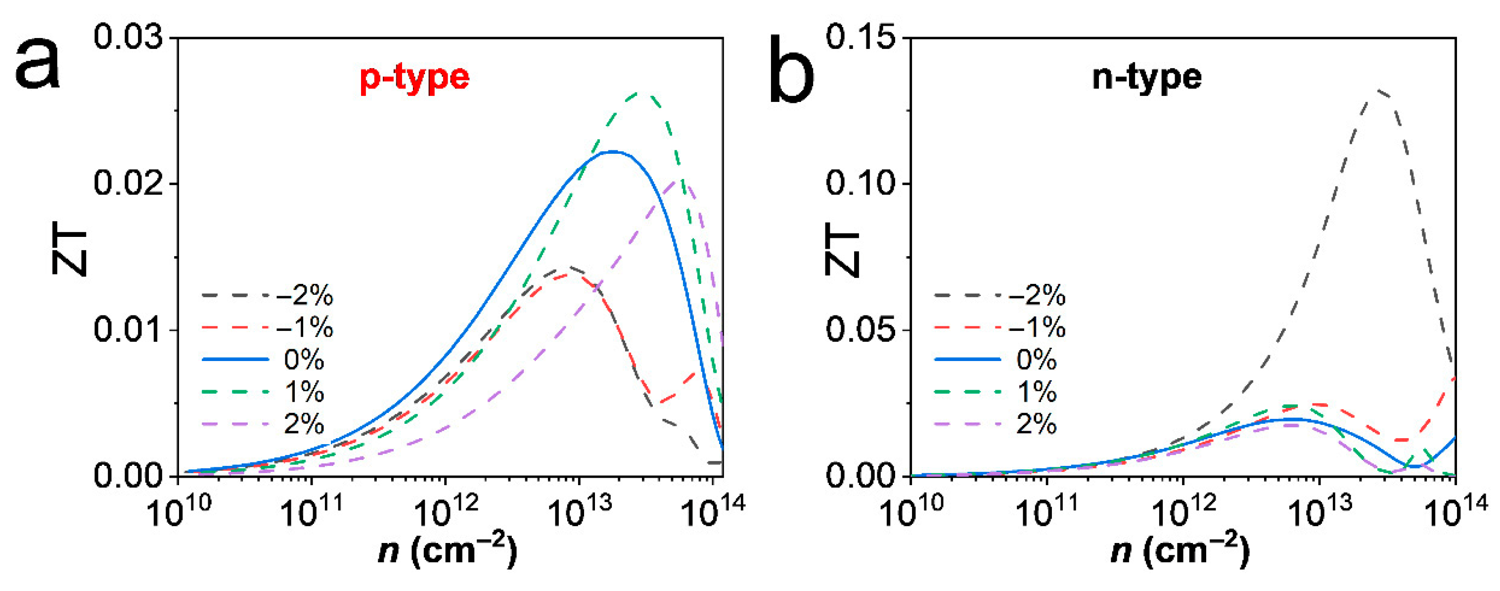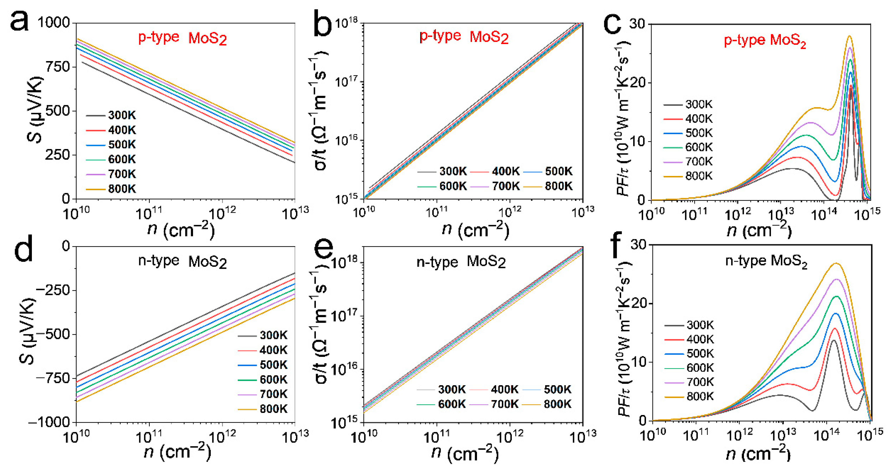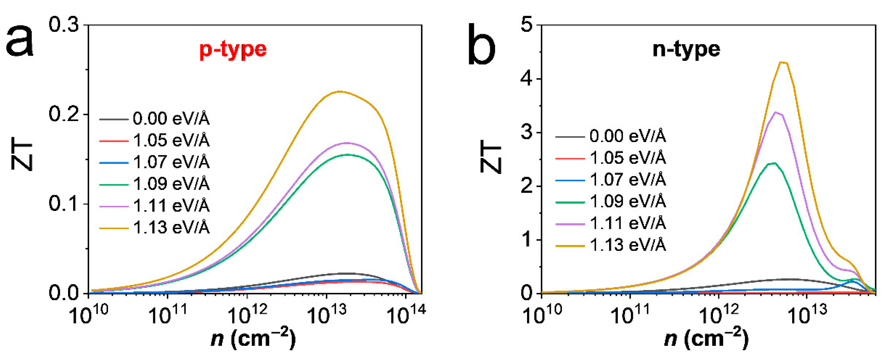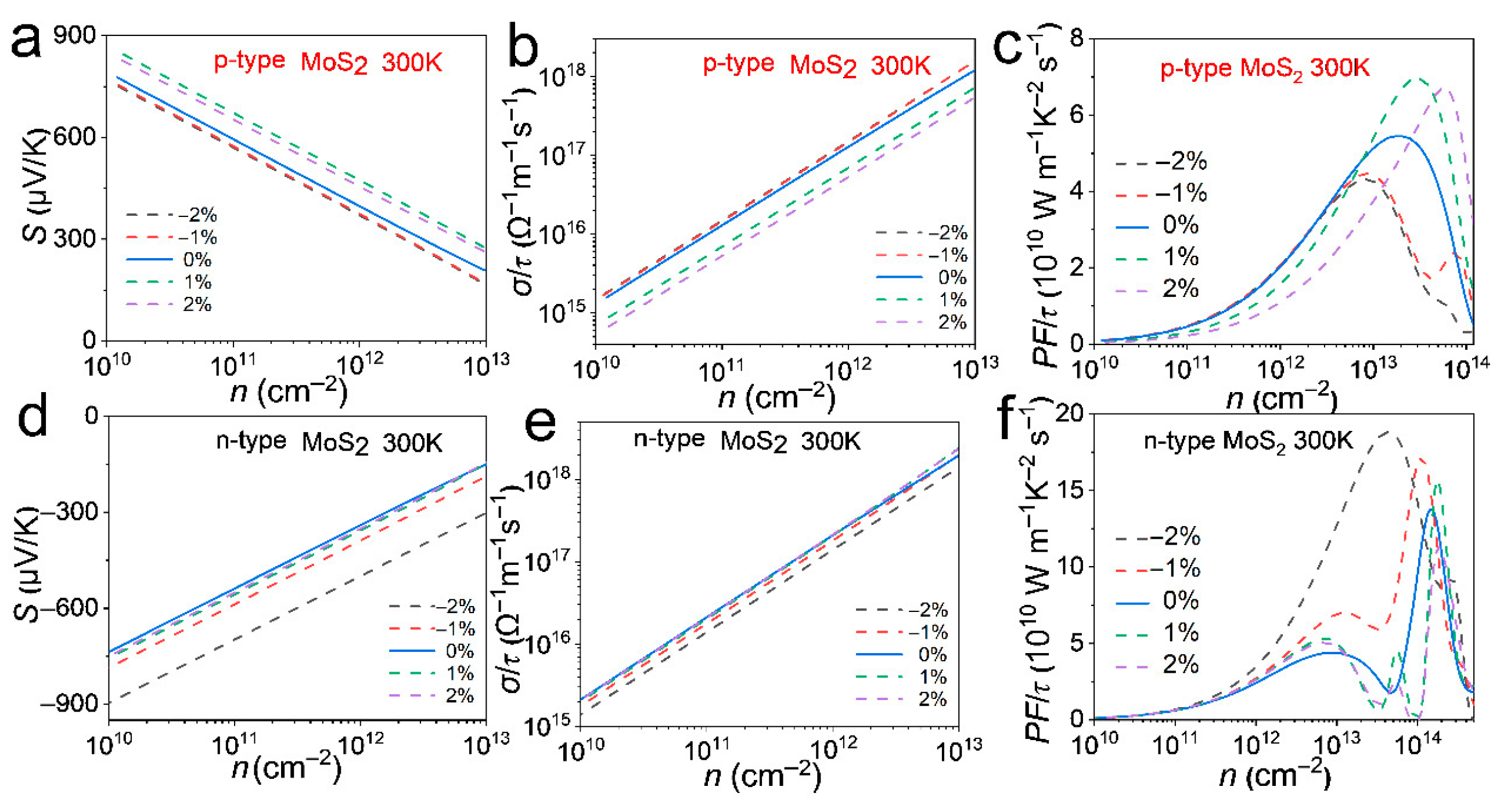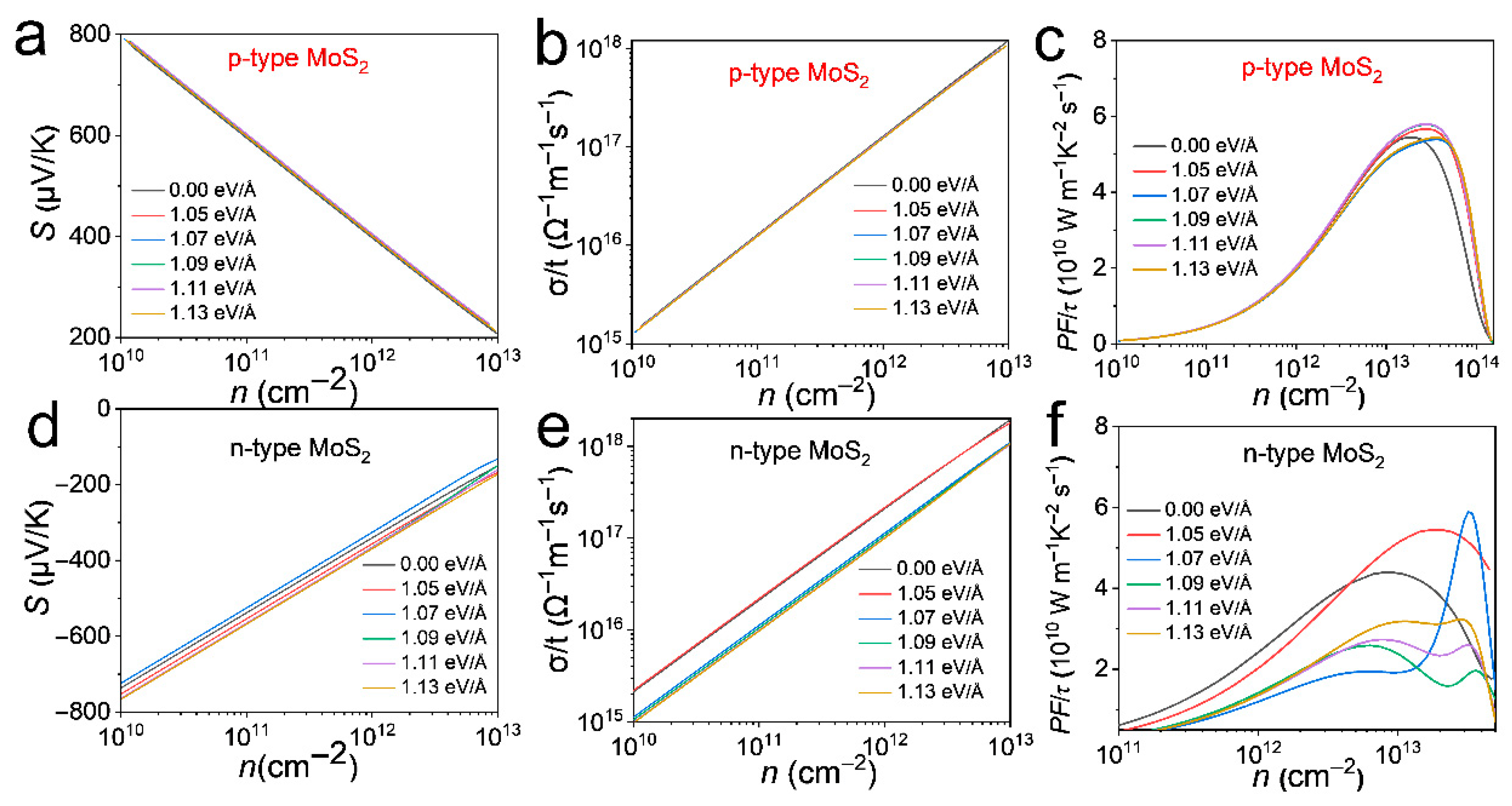 Collectively, these results underscore that c-axis electric fields act as a versatile knob for optimizing thermoelectric performance across carrier concentrations in MoS2. By precisely tuning electric field strength and carrier density, one can maximize ZT for both p-type and n-type conduction, leveraging unified mechanisms of band structure engineering and transport modulation. This electric field-driven strategy aligns with broader multi-parameter engineering frameworks—including strain and temperature tuning as discussed earlier—highlighting its potential to push MoS2-based devices toward higher energy conversion efficiencies in 2D thermoelectric systems.