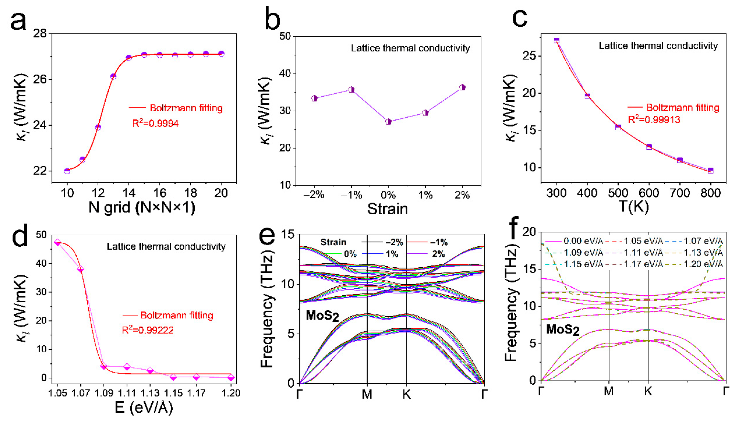 In practical device configurations, the ±2% uniaxial strain explored in this study can be achieved through lattice-mismatched heterostructures, where interfacial lattice differences between MoS2 (optimized lattice constant a = 3.166 Å) and adjacent materials induce intrinsic strain. Suitable heterojunction partners include WS2 (lattice constant ~3.15 Å, ~−0.5% mismatch, tunable to ±2% via growth control), AlN (~3.112 Å), and GaN (~3.186 Å), all of which exhibit sufficient lattice compatibility with MoS2 to generate the target strain range within van der Waals heterostructures. Focusing on monolayer MoS2 herein allows for isolating intrinsic strain effects from complex interfacial interactions, establishing clear baselines for how strain modulates bandgaps, carrier transport, and thermoelectric parameters—foundations critical for interpreting more complex systems.