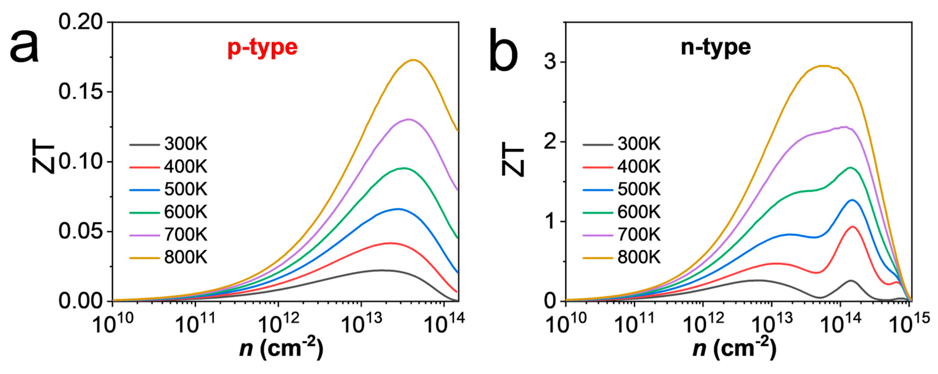 ZT values exceeding 1.0 achieved through strategies like doping, nanostructuring, and strain engineering. However, realizing high-performance TE devices necessitates further optimization of transport properties, particularly within two-dimensional (2D) systems that offer unique opportunities for tailored properties [