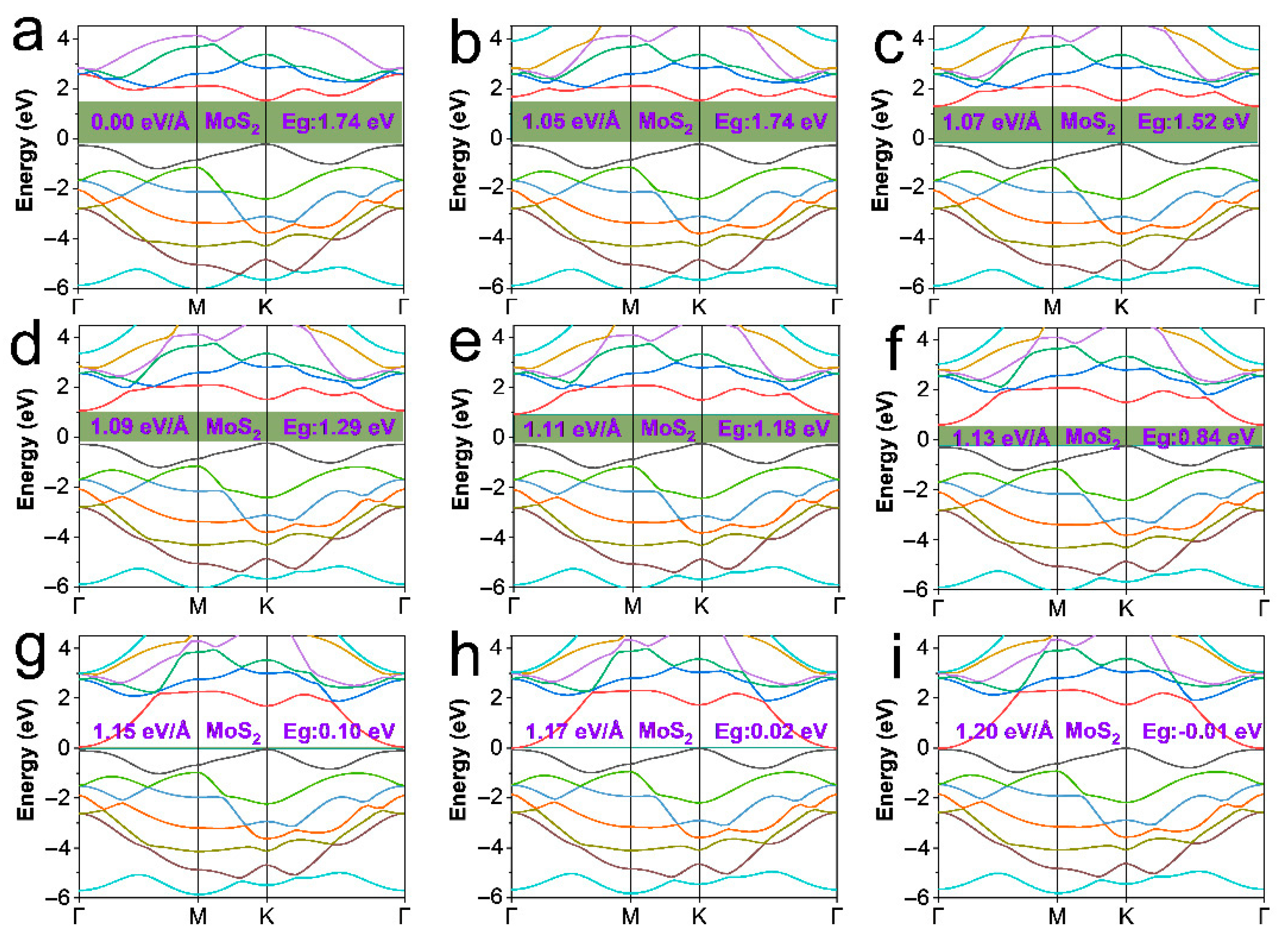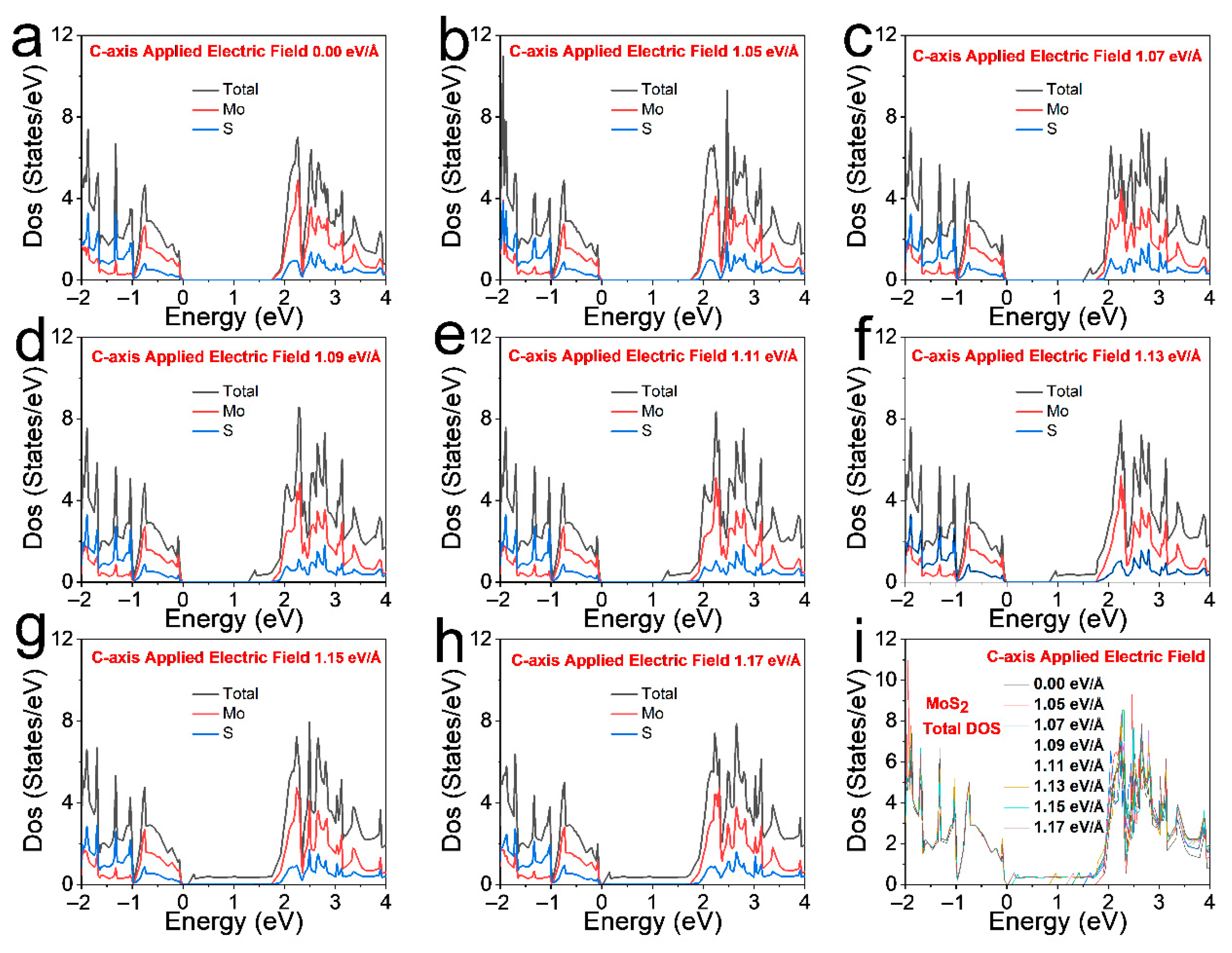 Figure 11i further illustrates the systematic variation in DOS with electric field strength, highlighting the ability of electric fields to tune the electronic states of MoS