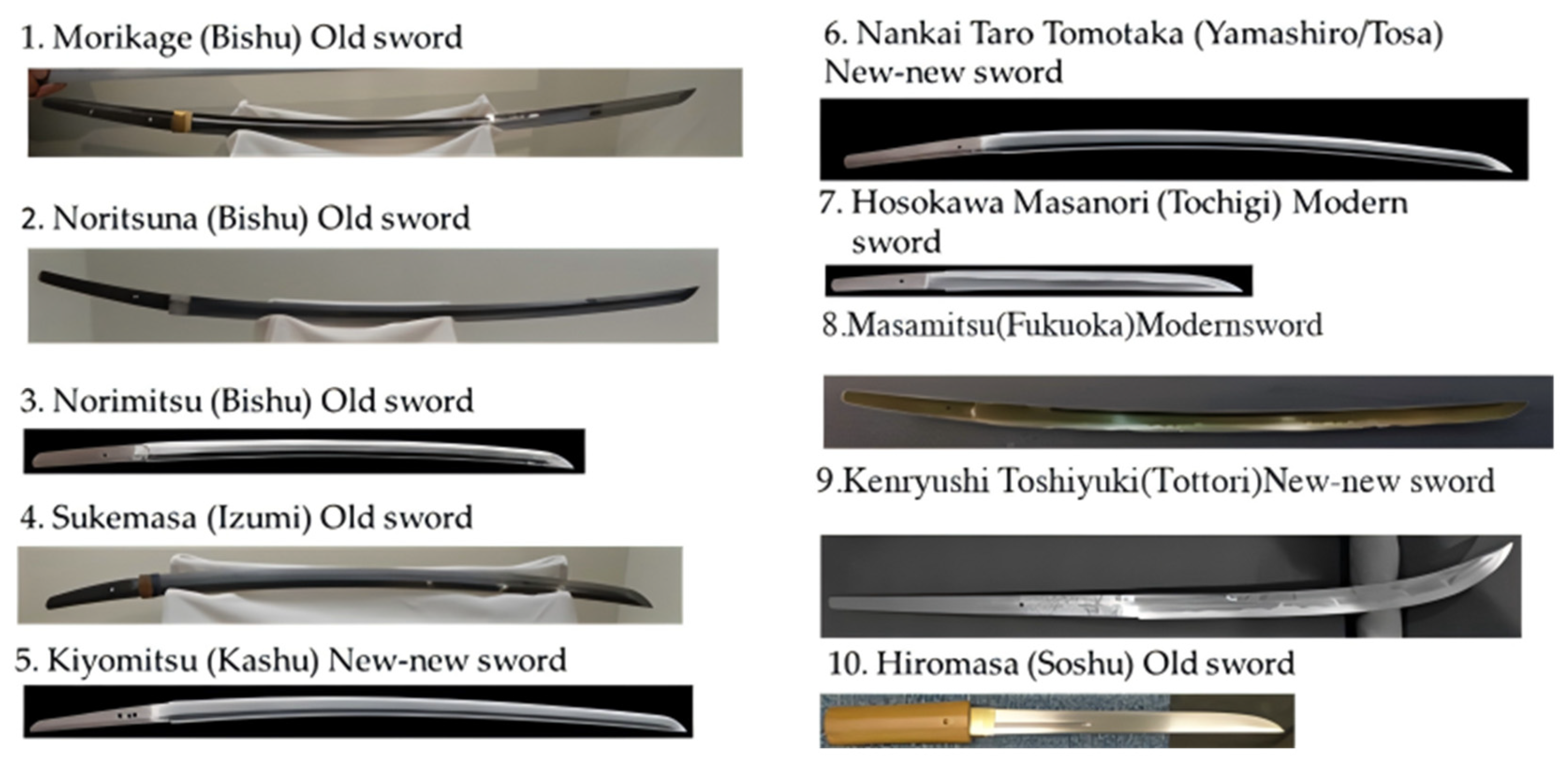 - Oikawa, K.; Matsumoto, Y.; Watanabe, K.; Sato, H.; Parker, J.D.; Shinohara, T.; Kiyanagi, Y. Energy-resolved neutron imaging study of a Japanese sword signed by Bishu Osafune Norimitsu. Sci. Rep. 2024, 14, 27990. [Google Scholar] [CrossRef]
