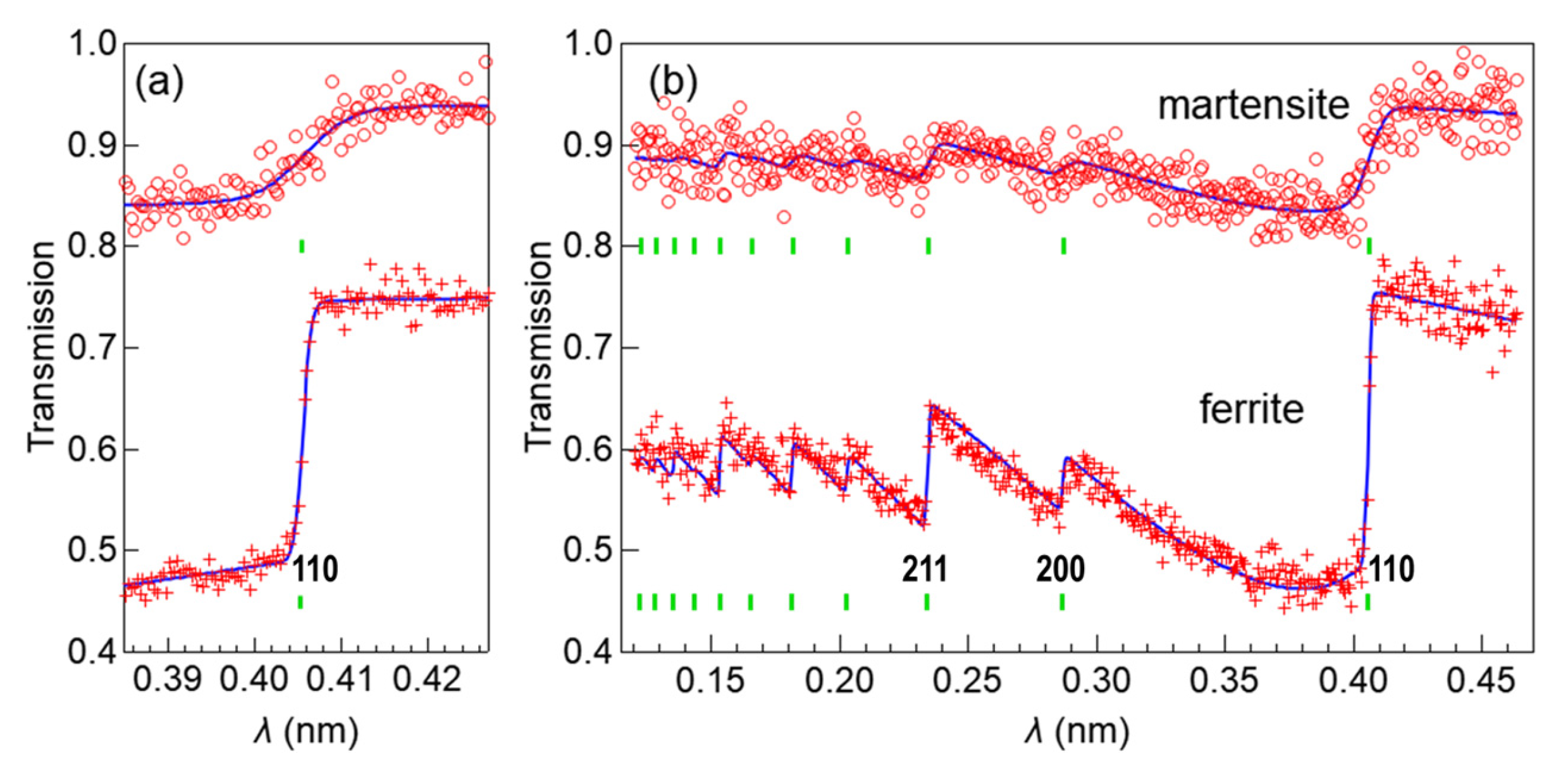 - Sato, H.; Sato, T.; Shiota, Y.; Kamiyama, T.; Tremsin, A.S.; Ohnuma, M.; Kiyanagi, Y. Relation between Vickers hardness and Bragg-edge broadening in quenched steel rods observed by pulsed neutron transmission imaging. Mater. Trans. 2015, 56, 1147–1152. [Google Scholar] [CrossRef]