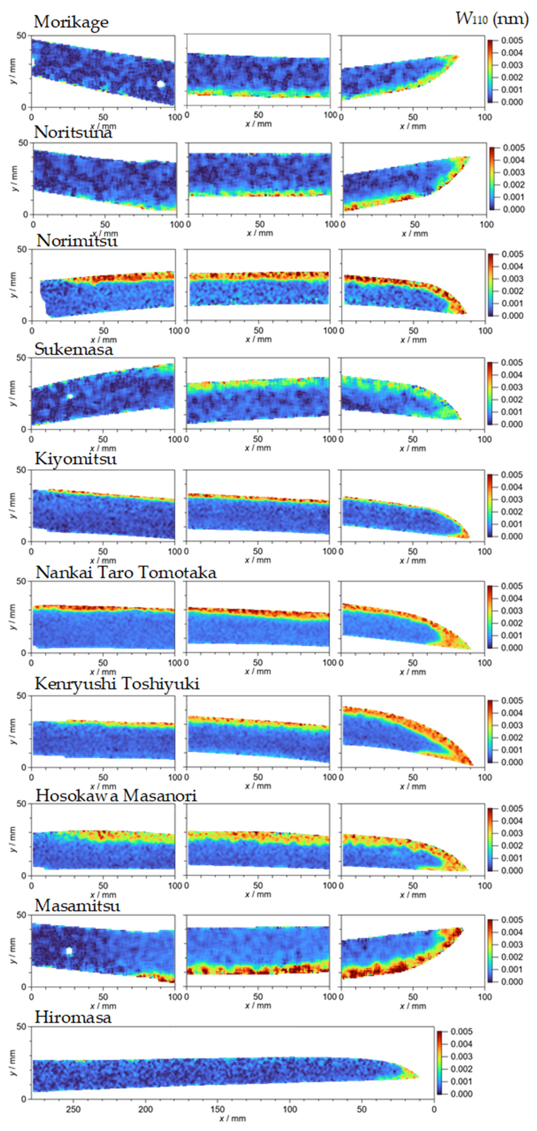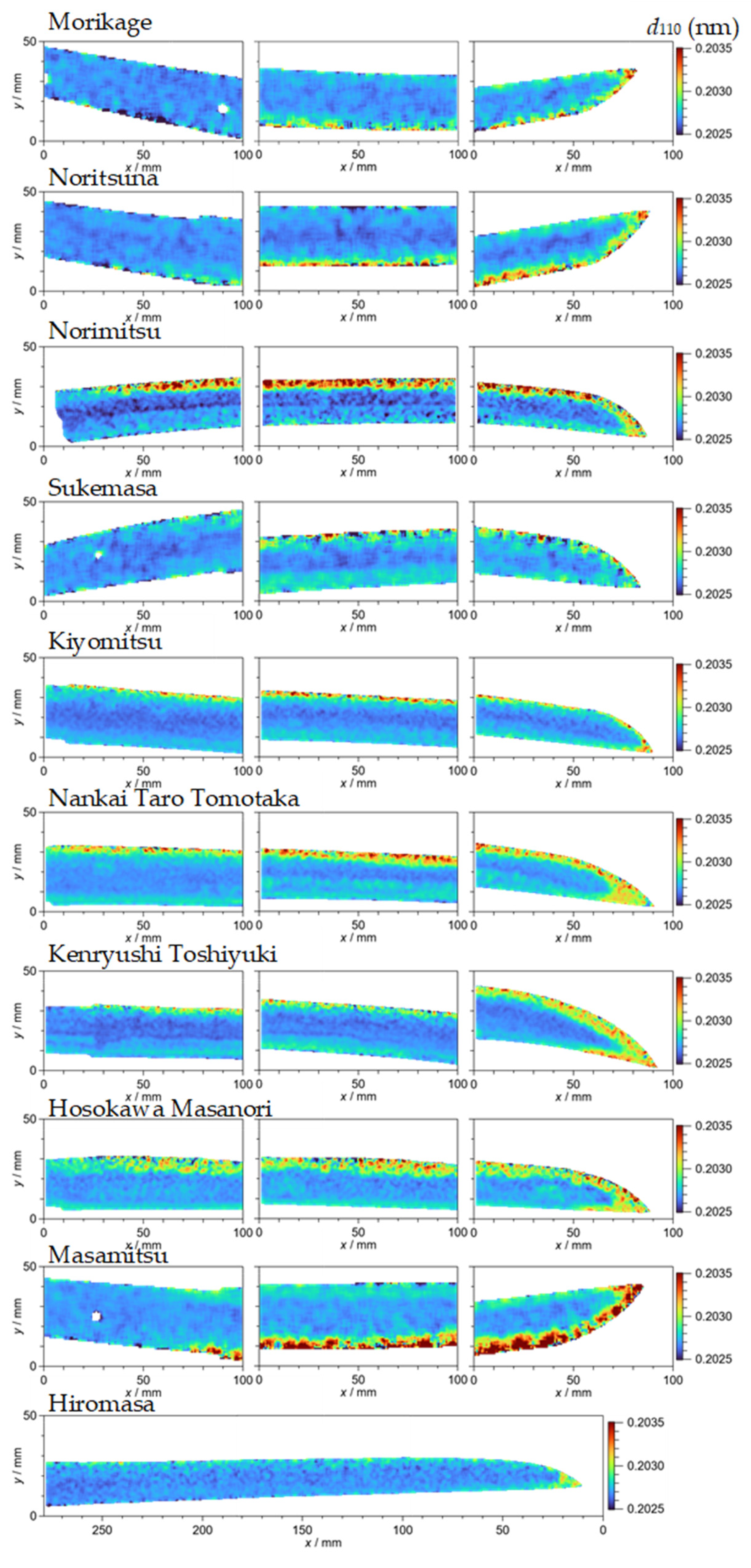 - Matsumoto, Y.; Oikawa, K.; Watanabe, K.; Sato, H.; Parker, J.D.; Shinohara, T.; Kiyanagi, Y. Nondestructive analysis of internal crystallographic structures of Japanese swords using neutron imaging. J. Archaeol. Sci. Rep. 2024, 58, 104729. [Google Scholar] [CrossRef]