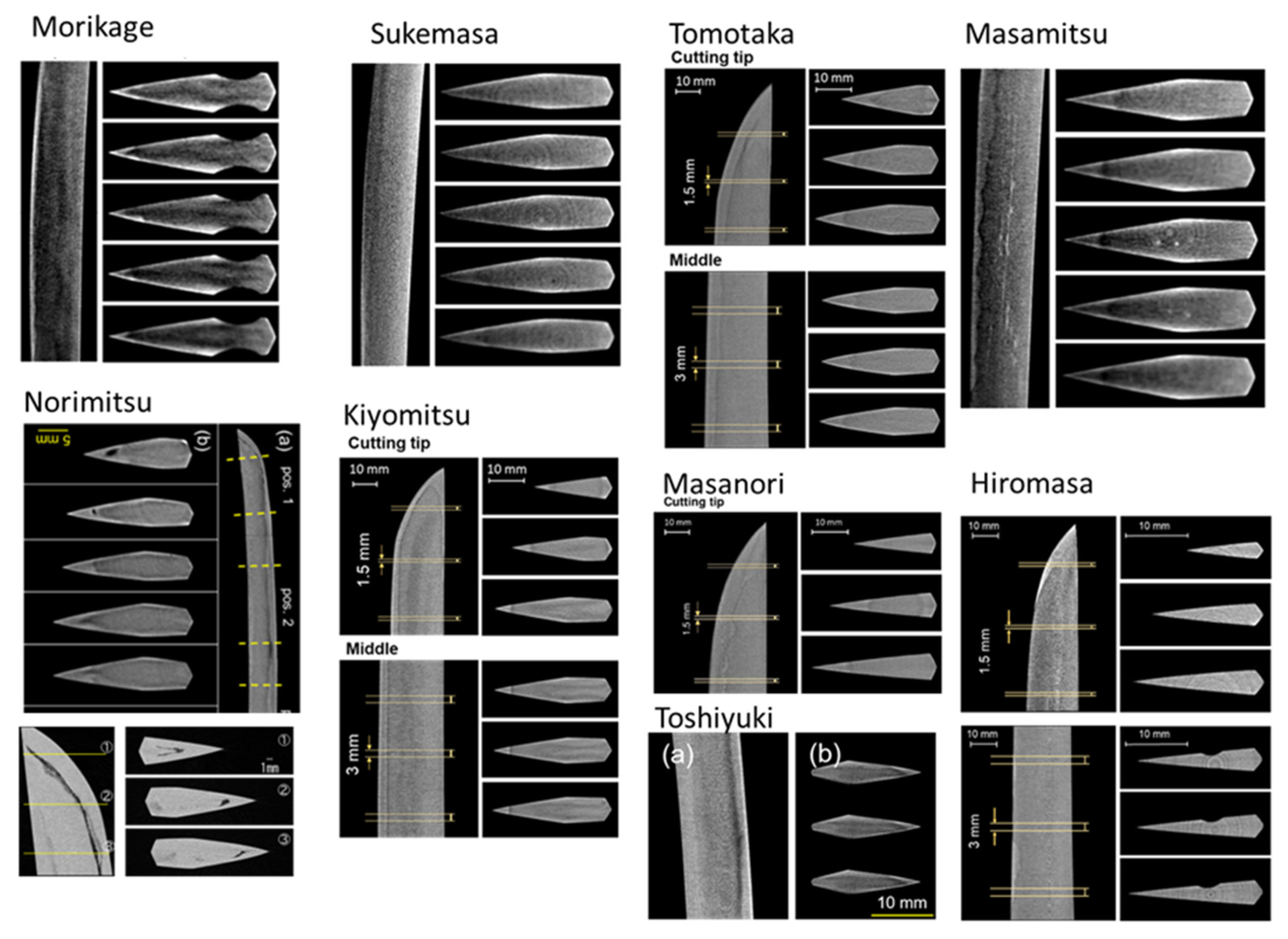 - Matsumoto, Y.; Watanabe, K.; Ohmae, K.; Uritani, A.; Kiyanagi, Y.; Sato, H.; Ohnuma, M.; Pham, A.H.; Morito, S.; Ohba, T.; et al. Comparative study of ancient and modern Japanese swords using neutron tomography. Mater. Res. Proc. 2020, 15, 221–226. [Google Scholar] [CrossRef]
