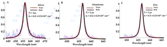 Accurate measurement of plasmas electron density is usually carried out utilizing the unique properties of the Hα-line at 656.27 nm [21,22] present in all emission spectra. Within the framework of NELIPS, the relative electron density is the more likely factor which determines any changes in the values of electron density from the bulk-material-based plasma to that from the corresponding nanomaterial-based plasma. Figure 1A–C present three examples of the normalized spectral line shapes of the Hα-line, utilizing emission spectra from silver, zinc, and aluminum at three different delay times as depicted in the subfigures (bulk-based plasma emission is plotted in black color and nanomaterial-based plasmas is plotted in red color), with the overall numerical results given in Table A1 (see Appendix B).