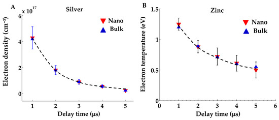 So far, an example of the temporal variation in electron density (as measured from bulk and nanomaterial targets) with delay time is presented in Figure 3A, utilizing the data of the silver element (present in both of nanomaterial and bulk forms), while the temporal variation in measured electron temperatures is shown in Figure 3B, utilizing the data of the zinc element’s spectral lines.
