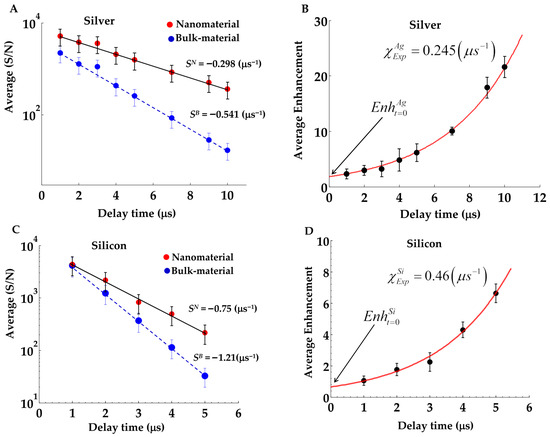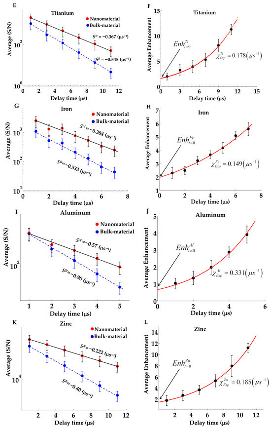 In order to explore the reasons laid behind by the obvious nonlinear increasing trend of the measured temporal variation in enhanced emission from different employed nanomaterials, we have drawn the average signal-to-noise (S/N) ratio from the different pure nanomaterials plasmas and the corresponding values from the bulk-based material plasmas on a logarithmic scale, with the results as shown in Figure 4A,C,E,G,I,K at the first column.