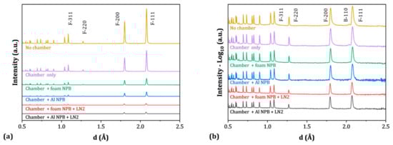 Diffraction patterns of a 316L stainless steel sample under different CCE configurations: (a) linear intensity scale and (b) logarithmic intensity scale. Peak notations: F = FCC, B = BCC.