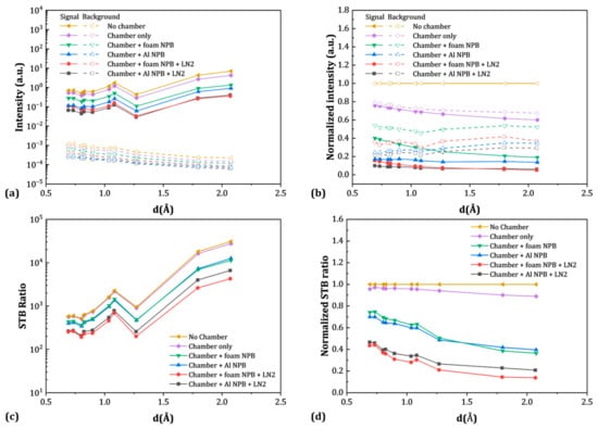 Signal and background intensities of selected diffraction peaks as a function of d-spacing: (a) fitted values, (b) normalized intensities, (c) STB ratios, and (d) normalized STB ratios.