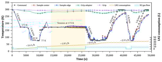Temperature profiles and LN2 consumption during cooling, holding at 77 K, warming, tensile testing at 173 K, and repeated cooling–warming cycles between 77 and 298 K.