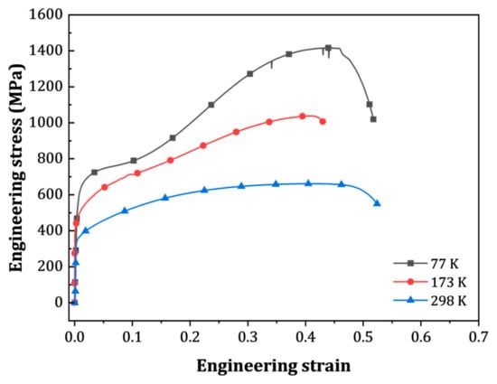 The stress–strain behavior highlights the strong influence of temperature on deformation. At 298 K, the steel yields at ~350 MPa and gradually hardens to ~660 MPa at 40% strain. At 173 K, the yield stress increases to ~460 MPa, followed by pronounced strain hardening to ~1040 MPa at 40% strain. At 77 K, the effect is even more dramatic, with the steel yielding at ~630 MPa and hardening continuously to ~1420 MPa at 44% strain. A notable feature at 77 K is the onset of a secondary hardening regime beginning at ~10% strain, which is absent at higher temperatures.