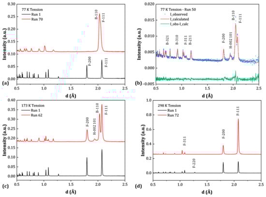 Diffraction patterns in the loading direction for the first and last sub-runs during tension tests at (a) 77 K, (c) 173 K, and (d) 298 K. (b) Example of full-pattern Rietveld refinement for sub-run 50 during the 77 K test. Peak notations: F = FCC, B = BCC, H = HCP.
