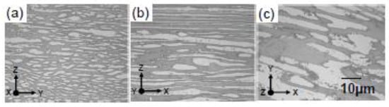 SEM microstructures observed on the planes X, Y and Z for LNi are presented in Figure 3. These microstructures consist of α and γ phases, being similar to the cases of the previously reported cast steels although the morphology and grain size of the α phase are significantly different from each other; both of the α and γ grains are elongated along the rolling direction (X-axis) with similar grain sizes, which are commonly observed for LNi and HNi.
