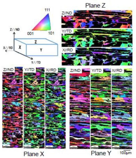 Inverse pole figure (IPF) maps related to three directions for the ferrite (α) phase in steel LNi observed on three orthogonal planes X, Y and Z. The insets are the definition of plane and direction and the standard color triangle IPF for crystal orientation, respectively.