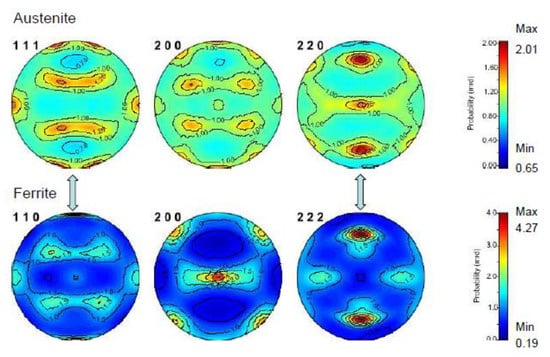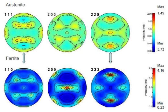 Pole figures of austenite and ferrite obtained by neutron diffraction for steel LNi-A.