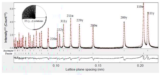 To obtain more quantitative and global information about texture and true phase volume fractions, neutron diffraction profiles from 525 directions (scattering vectors) were collected and analyzed using MAUD software [17], and an example of Rietveld combined analysis for texture and phase volume fraction is given for LNi in Figure 6. The volume fraction of the γ phase obtained from the combined analysis was 51.34 (±0.05)%, which was sufficiently precise after the quantitative evaluation of the global phase textures. The pole figures were re-constructed from these diffraction analysis data and presented in Figure 7. The Kurdjumov–Sachs (K-S) orientation relationship between the α and γ phases [23] has been confirmed through the microstructure observation of duplex stainless steels using transmission electron microscopy, so far [24,25,26], and such an orientation relationship was suggested partially for LNi from Figure 7 (see arrows). It is believed that the present duplex stainless steels solidified firstly as α phase and then that γ grains precipitated having the K-S relationship with the α matrix upon cooling. During hot rolling, work hardening, dynamic recovery and recrystallization in α and γ grains and probably additional γ precipitation took place. Upon cooling after the hot rolling, the static recovery and recrystallization must occur. Then, the static recovery, recrystallization, grain growth and coalescence would happen during annealing. Interestingly, even after such a complicated heat history, the K-S relationship was partially kept between the α and γ phases in Figure 7. As shown in Figure 4, the grain growth and coalescence seem to take place in LNi-A. Figure 8 shows the result of MAUD fitting for LNi-A; the volume fraction of γ was 45.90 (±0.05)%. The pole figures in Figure 9 suggest that the texture of γ became weaker compared with that for LNi because of annealing at a higher temperature for a longer time. In order to obtain more detailed texture information, the ODF figures for LNi and LNi-A are depicted in Figure 10. As seen, the texture is relatively weaker for LNi-A than LNi caused by grain coarsening. Here, it should be noted that {100}<110> component marked by arrows in Figure 10 is very intense for the α phase. This implies that {100} cleavage fracture takes place easily along the Z-plane.