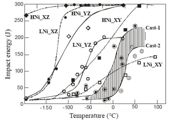 The comparison between LNi and HNi is summarized in Figure 13, in which the results for cast duplex stainless steels reported previously [10,11,12] are also presented. Consequently, the DBTT of duplex stainless steel depends greatly on the crack propagation direction for the hot-rolled plates. The reason why DBTT is so sensitive to the crack propagation direction is speculated to be related to the texture and microstructural features. The difference between the hot-rolled plates and cast steels must be mainly due to the α grain size and connectivity; as reported in Reference [11], the α grains observed separately in a two-dimensional observation were frequently connected three-dimensionally, which was revealed by a serial sectioning observation method. The DBT behavior in the cast steels was influenced by casting conditions such as metal- or sand-mold, casting temperature, etc., but this influence is much small compared with the influence of crack propagation direction in the forged duplex stainless steels. The increase of Ni content is also observed to lower DBTT in both of cast and forged duplex stainless steels, similarly to the general trend observed in ferritic steels [27,28]. The effect of Ni on DBTT is not clear and still open for discussion.
