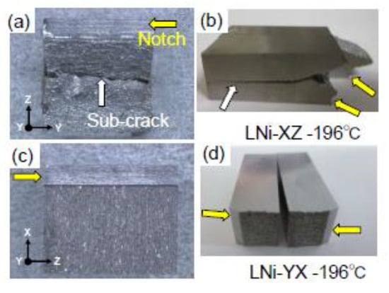 The influence of crack propagation direction on the DBT curve obtained by Charpy impact tests for LNi is presented in Figure 11; crack propagation plane is perpendicular to the X axis (X-plane) in (a) whereas to the Y axis (Y-plane) in (b). As can be seen, the DBT behavior depends apparently on the crack growth (or notch) direction; the DBTT for specimen XZ of LNi is significantly lower than specimen XY in Figure 11a. Similar trend is observed for LNi-A with coarse grains but the difference between specimens XZ and XY is small. A higher DBTT for specimen XZ of LNi-A compared with that for XZ of LNi is postulated to be caused by coarser grains with higher connectivity (see Figure 4), and weaker texture of the α phase. Similar trend is found in the case of crack propagation along the Y plane in Figure 11b. Here, DBTT was determined by estimating the temperature to show the mean impact energy between the upper and the lower shelves. The upper shelf energy is found to be lower in Figure 11b than in Figure 11a, particularly for the specimen YZ and YX of LNi-A. The lower ductility at temperatures higher than DBTT must be attributed to the anisotropic microstructure. Consequently, when the crack propagation direction is parallel to the Z direction, the DBTT is commonly lower both in (a) and (b), suggesting a characteristic fracture mechanism along the Z-axis; the occurrence of delamination will be explained later.