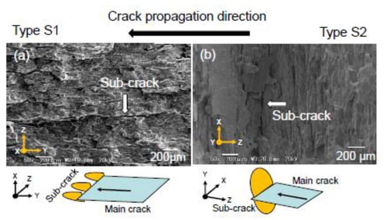 Typical outlooks of fractured specimens are presented in Figure 14. As can be found in (a) and (b), sub-cracks perpendicular to the main crack growth direction were observed for specimen XZ of LNi fractured at −196 °C. That is, so-called “delamination” occurred for specimen XZ of LNi, leading to lower DBTT. Contrary to this case, fracture surface is almost flat for specimen YX of LNi in (c) and (d), although short sub-cracks are observed. The sub-cracks were found always along the Z plane and classified into two types, S1 and S2. Fractographic features observed at a higher magnification for these two types are presented in Figure 15a,b, respectively; type S1: the sub-crack plane normal is perpendicular to the main crack propagation direction and type S2: sub-crack plane normal is parallel to the main crack propagation direction (see illustrations in Figure 15). As would be expected, the type S2 is much more effective to hinder the main crack propagation which is called “delamination toughening” [29,30,31]. That is, a specimen with a notch oriented towards the crack propagation along the Z-axis shows lower DBTT due to the occurrence of delamination. Fracture surface with delamination observed at a higher magnification is presented in Figure 16, which consists of cleavage fracture of α grains and ductile fracture of γ grains. Examples of crystallographic characteristics of a sub-crack examined with SEM/EBSD on the sectioned planes of fractured specimens are presented in Figure 17; (a) shows several sub-cracks in the vicinity of a main crack. It is also observed that fracture surface perpendicular to the main crack (see arrows in the figure). Sub-cracks were examined with EBSD in detail and a typical example is shown in Figure 17b–d, revealing that the sub-crack took place along α{100} plane perpendicular to the Z-axis (see b). Here, the sub-crack is speculated to stop its propagation at the α/γ interface. Consequently, the {100} cleavage on the Z plane occurs frequently even in the case that a main crack plane is perpendicular against it. Hence, although specimens ZX or ZY were not examined because it was difficult to prepare such a specimen (see Figure 1), the DBTT for such specimen is postulated extremely high due to the occurrence of preferential {100} cleavage fracture along the Z plane without accompanying any sub-cracks.