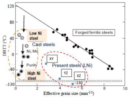 DBTT as a function of the effective grain size (the data for forged ferritic steels were replotted from References [22,33]).