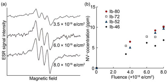 NV− centers in triplet ground state can be observed by ESR [,]. The typical ESR spectrum of NV− center shows eight peaks caused by zero-field-splitting by spin-spin interaction at ground triplet state and four orientations of its electron orbitals due to tetrahedral symmetry. Figure 4a represents the lefternmost peak of NV− centers where one crystallographic axes, [111], is aligned to the external magnetic field (B0). The spectra clearly show hyperfine splitting by nitrogen nuclear spins. The intensity of spectra obviously increases with increasing irradiation fluence. [NV−] was calculated and plotted as a function of irradiation fluence in Figure 4b. In contrast to P1 centers, NV− centers increase with increasing irradiation fluence. As a result, 10 ppm of NV− are created in Ib-80 by electron irradiation at the fluence of 8.0 × 1018 e/cm2.