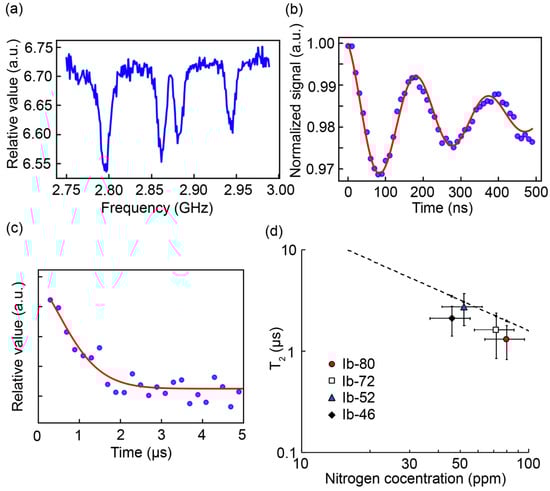 Evaluation of spin coherence time (T2) of NV− center in type-Ib diamond. (Sample: Ib-72 at fluence of 8 × 1018 e/cm2 for (a–c)). (a) CW-ODMR spectra. (b) Rabi oscillation and fitting by damped sine curve. (c) Spin echo decay with free precession time and fitting by stretched exponential decay. (d) Dependence of nitrogen concentration on T2 (Double logarithmic plot). Ib-80 (closed red circle), Ib-72 (open black circle), Ib-52 (closed blue circle), Ib-46 (closed black circle), respectively. Broken line shows Equation (1) [].