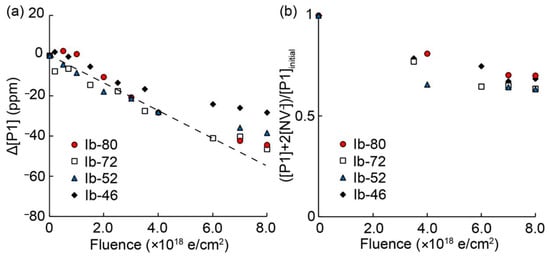 Here, Figure 2b was replotted in Figure 6a as the change in P1 center concentration from the [P1]initial (Δ[P1]) due to electron irradiation followed by annealing. Δ[P1] for all samples decreases linearly with increasing irradiation fluence, especially for the low fluence range (~4.0 × 1018 e/cm2; see the broken line for visual guide). This result means that the consumption of P1 centers depends on irradiation fluence, but not on [P1]initial in the case of high [P1]initial density, such as 45–80 ppm. In other words, the creation of NV− might be limited by the creation of vacancies. On the other hand, the decreasing rate of P1 center becomes lower with increasing irradiation fluence in fluence ranges from 6.0 × 1018 e/cm2 to 8.0 × 1018 e/cm2, and this tendency is larger when [P1]initial is smaller. Thus, the P1 center consumption is lower especially in low [P1]initial samples, although [P1] still remains even after irradiation at fluence of 8.0 × 1018 e/cm2. This suggests that the probability of recombination of P1 centers and vacancies is lower due to smaller amounts of P1.