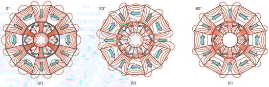 Schematic diagram of the mechanism of the Nest-Rot-SPM; (a) maximum strength position where the outer ring is in phase with the inner ring; (b) 30° rotated; (c) minimum strength position where the outer ring is out of phase (60°). The arrows indicate the easy axes of the magnet pieces. The pieces without arrows are made of soft magnetic material. Reprinted with permission from Ref. [] 2009, Elsevier.