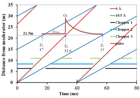 Figure 3 depicts the CSNS-VSANS time-distance diagram. The positions and the opening time range of the three disc choppers and neutrons from 6 Å to 10.5 Å transmitting the choppers are presented. The lens and the sample are around 21.5 m apart from the moderator. A pulse’s neutron will pass through the lens from Tp to Te, but no neutrons will pass through the lens from Tb to Tp. As illustrated in the inset of Figure 3, the G factor should remain constant at from Tb to Tp, rise suddenly from to at Tp, and then decrease from Tp to Te, according to Formula (18).
