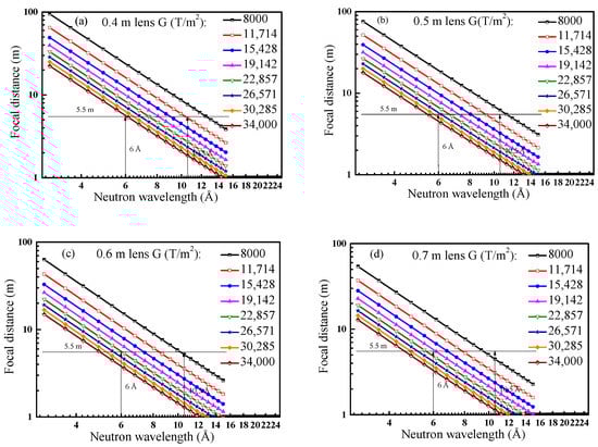 In a SANS instrument, neutrons are frequently polarized by a polarizing supermirror with transmission geometry. The obtained spin-down neutrons obtained will be defocused by the lens. Thereby, a polarizing flipper must be inserted before the lens to flip the spin-down neutrons to spin-up. Only roughly 1.6 m of space remains in the CSNS-VSANS for the polarizer, lens, and sample; thus, the lens must be less than 1 m. The focal distance of the lens is a function of the neutron wavelength, G factor, and lens length, according to Formula (16). As shown in Figure 5, the focal distance of the lenses of various lengths and the G factors at various neutron wavelengths are determined. Using a 0.5 m lens with a G factor of around 3 × 104 T/m2, 6 Å neutrons may be focused with a focal distance of around 5.5 m. The G factor of 3 × 104 T/m2 corresponds to a bore diameter of about 20 mm, according to previous analysis.