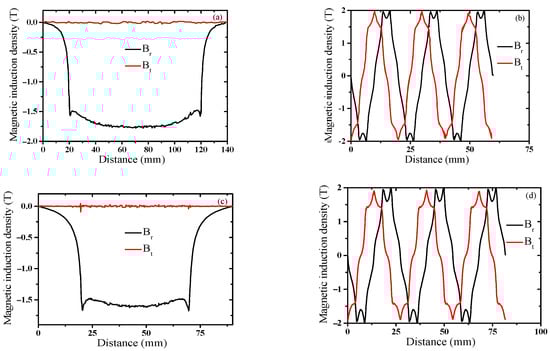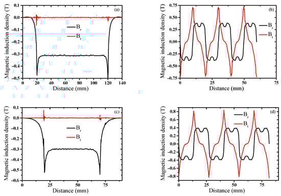 Magnetic field (T) at 0° rotating angle. (a) Br and Bt along the z-axis of model 1; (b) Br and Bt along the circle of model 1; (c) Br and Bt along the z-axis of model 2; (d) Br and Bt along the circle of model 2.