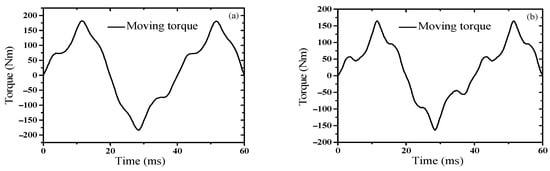 There will be an alternative torque between the inner and outer sextupoles when rotating the latter. This is due to the same-pole attract, opposite-pole repel principle. As shown in Figure 1, the three northern poles of the outer sextupole face the three southern poles of the inner sextupole at 0°, whereas the three southern poles of the outer sextupole face the three northern poles of the inner sextupole. Except for the strongest magnetic field in the bore of the lens, all attractive forces are balanced, and there is no torque. There is a magnetic torque drawing the outer poles back to 0° at 30° due to the attraction between the six poles of the outer sextupole and the six poles of the inner sextupole. At 60°, the three northern pole of the outer sextupole faces the three northern pole of the inner sextupole, while the three southern poles of the outer sextupole face the three southern poles of the inner sextupole. Except for the lowest magnetic field in the bore of the lens, all the repulsive forces are balanced, and there is no torque. At 90°, the outer poles are propelled forward by the repulsive forces to 120° which is the angular cycle of the torque. Since the torque first drew back the rotation from 0° to 60° and then pushed forward the rotation from 60° to 120°, the torque should be mostly countered with two identical Nest-Rot-SPMs with a 60° phase difference linked together by gears or a belts. B rotating the outer circle at a speed of 500 revolutions per minute, the torque between the inner and outer sextupole is simulated. Figure 9 displays the results of the torque simulation results for model 1 and model 2. The maximum torques for Models 1 and 2 are 182 Nm and 164 Nm, respectively. A powerful motor is needed to drive the outer circle with such a large torque. The torque curves resemble an asymertric sine function. According to Figure 9a, the torque first rises from 0 to 182 Nm and then decreases back to 0 Nm from 0 to 20 ms, and then it increases from 0 to −182 Nm (negative signifies the opposite of the direction of rotation) and then descends back to 0 Nm from 20 to 40 ms. By shifting the curve in Figure 9a by 20 ms (or 60°), it will be a mirror image of the original curve and a force offset the original torque. Therefore, the majority of the torque can be countered by a twin Nest-Rot-SPM with a 60° phase shift.