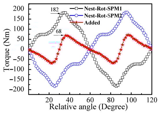 Figure 10 depicts the torque canceling effect with two identical Nest-Rot-SPMs with 60° phase difference. The leftover torque of the twin Nest-Rot-SPMs is around one-third of that of a single Nest-Rot-SPM, which is the same as the results from the reference []. Because the repetition rate of the residual torque is two times lower than the original rate, it can be further reduced with a small torque canceler that rotates twice as fast as the Nest-Rot-SPM.