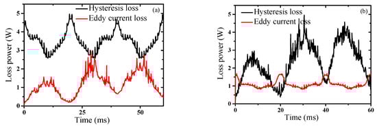 Eddy current loss and hysteresis loss in the inner ring of the Nest-Rot-SPM at different temperatures: 188.1 °C (a) and 158.5 °C (b).