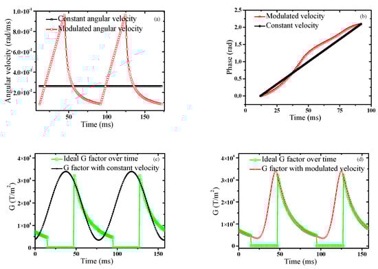 In actuality, to control the angular velocity of the Nest-Rot-SPM, according to Formula (22), a fairly powerful motor is required. The motor will typically rotate at a constant angular speed, with the G factor changing sinusoidally over time. The sine function’s high falling edge may be approximate to the ideal 1/t2 dropping.
