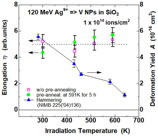 Irradiation temperature dependence of the degree of the shape elongation of V NPs in SiO2, defined by Equation (1), induced by irradiation with 120 MeV Ag9+ ions to a fluence of 1.0 × 1014 ions/cm2, without pre-annealing (open circles) and with pre-annealing of 591 K for 5 h (closed circles). The dependence of the deformation yield A of SiO2 ascribed to the ion hammering effect was collected from Ref. [9]. Solid lines and horizontal broken lines are guides for eyes.
