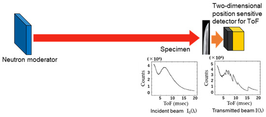 Here, we introduce experimental methods for better understanding, although this is a review article. The measurements on the swords were performed on RADEN at a beamline number 22 (BL22) in J-PARC/MLF (Material Life Science Experimental Facility) [34]. RADEN is a dedicated instrument for energy-resolved neutron imaging, but it can also be used for traditional imaging. A schematic view of the experimental layout is shown in Figure 3. Neutrons emitted from a neutron moderator are scattered and absorbed by a specimen, and transmitted neutrons are detected by a two-dimensional position-sensitive detector. The neutron energy (wavelength) is determined by a neutron’s time-of-flight traveling from the moderator to the detector (time-of-flight method: ToF). An incident neutron spectrum I0(λ) and a transmitted spectrum I(λ) are also shown. Wavelength resolution is about 0.2% at 0.2 nm at a position of 23 m from a moderator. A photo of a sword set in front of a neutron detector is shown in Figure 4. A boron-type neutron imaging detector was used for BET imaging. A CCD camera with 6LiF/ZnS was used for the neutron CT measurements. All CT datasets were reconstructed using the filtered back projection algorithm.