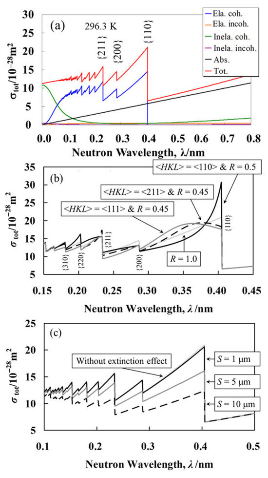 Total neutron cross-section indicating each component (a), change in the entire effective total cross-sections due to anisotropy parameter R and preferred orientation axis <HKL> (b), and crystallite size S (c). Figure (b,c) were taken from Ref. [17].