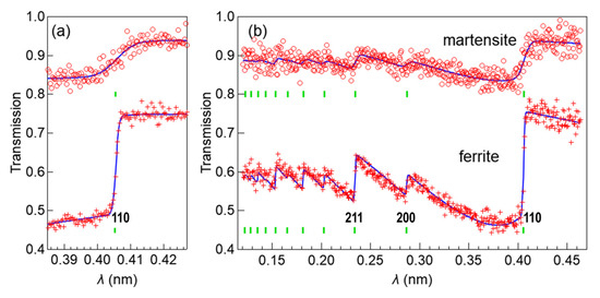 Figure 6 shows examples of transmission data obtained for Norimitsu [31]. Figure 6a presents the wavelength-dependent transmission spectra around {110} and (b) over a wide wavelength range. d110 is obtained by analyzing the spectrum shown in (a), and this requires higher wavelength resolution than (b). Therefore, the time bin is narrower in (a) than (b), and the data are different. The crystal structure and phase information are obtained from the edge positions. In a martensite transformation, the body-centered-cubic structure of α-Fe changes to a body-centered-tetragonal structure with c/a > 1. The edge slope of {110} in the martensite becomes gentle or broad [18], as clearly recognized when comparing the upper figure (martensite) with the lower figure (ferrite) in Figure 6a. We obtain the width of the edge broadening, W110, by analyzing the single-edge structure around {110}, and then we can identify the area of the martensite, i.e., the quenched area in the sword. The crystallite size S and the anisotropy parameter R are obtained by analyzing the overall structures of the transmissions shown in Figure 6b. In the figures, fitting results of the RITS simulations are also indicated. Here, the data were analyzed from 0.12 nm to 0.46 nm for wide-wavelength analysis. The pixel size of the detector was 0.4 mm, but 1.2 mm area data were used for the analysis to obtain good statistics. In all analyses and discussions in this paper, the crystal structure of steel (ferrite/martensite phase) is assumed to be a single-phase body-centered-cubic (BCC) structure. The analysis does not include cementite in pearlite and retained austenite because their contribution to the BET spectra is negligible.