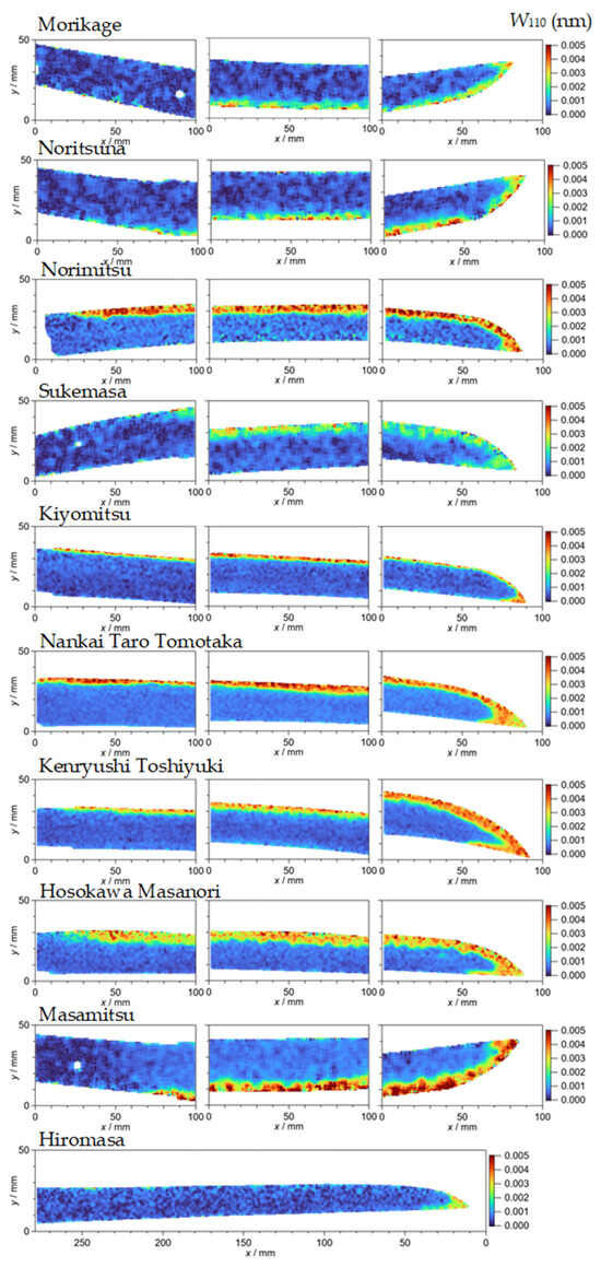 Figure 7 shows the widths of the edge broadening at the {110} edge, W110 in nm, to indicate martensite or quenched areas. The color bar range is from 0.0 to 0.005 nm. W110 values of three old swords, Morikage, Norimitsu, and Sukemasa, were not as high as that of Norimitsu, since the latter has wide red areas but the other three swords have green areas wider than Norimitsu. Norimitsu is a saiha sword and would have been quenched again in later years. The quenching areas of Tomotaka, Toshiyuki, Masanori, and Masamitsu appear clearly compared with these old swords. The quenching area of Kiyomitsu is narrow but can be clearly observed. This reflects the narrow straight hamon. These results suggest that the quenching of the old swords was weaker than that of the later swords. However, Hiromasa has a quenched area only around the tip but not at the edge side. This may be due to the edge being polished over time.