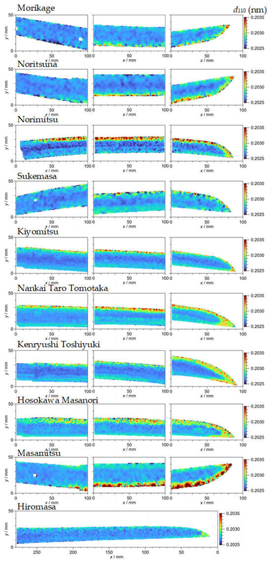 Figure 8 shows the mapping of the lattice plane spacing d110. The color bar range is from 0.2025 to 0.2035 nm. Largest lattice plane spacings are observed at the edge sides for all swords other than Hiromasa, and this is due to martensite. At the back side, areas of larger lattice plane spacing were sometimes observed, and this is considered to be due to bending of the swords by quenching. The values and areas of the larger lattice plane spacing are different from each other, and this suggests different sword-making processes among the swords. However, there is no such area for the short sword, Hiromasa, because there was almost no bending.