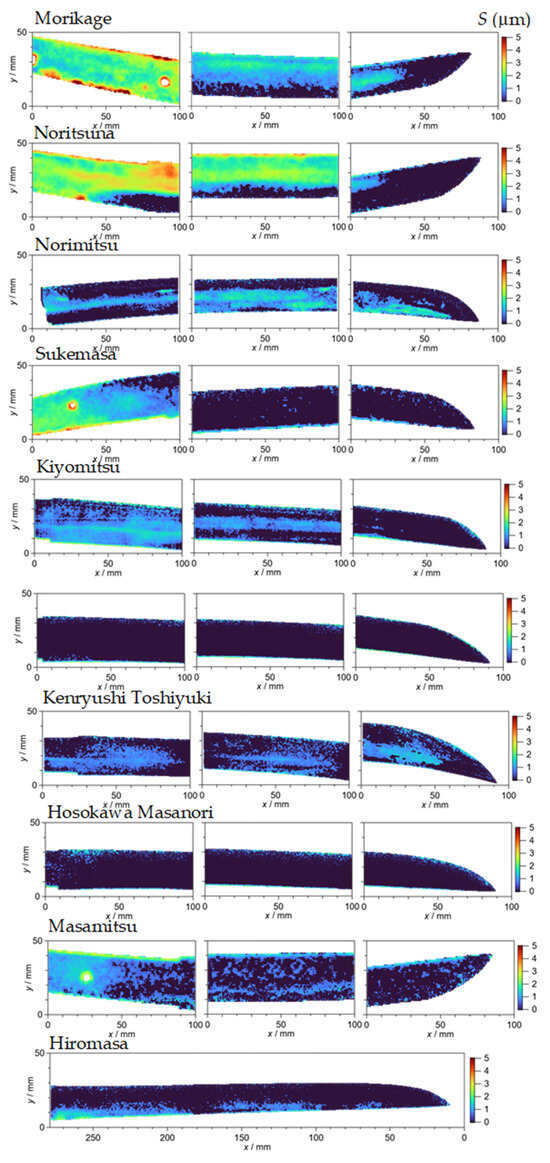 Figure 10 shows the mapping of the crystallite size S in µm. The color bar range is from 0 to 5 µm. It is known that the carbon content affects the crystallite size. The grain size increases from the edge to the back for Kobuse (in Japanese) structure [41]. In this sword, a soft steel with low carbon content (core steel) is covered with a hard steel with high carbon content (surface steel), except on the back surface of the sword. A similar trend was observed in the study on a piece of an old sword [5], in which the grain size was 10–15 µm at the edge side and become larger toward the backside. The grain size is larger than the crystallite size since the crystallite size reflects the size of the perfect crystal in a grain through the first order extinction. The crystallite size as obtained by BET exhibits a similar trend in the size change to the grain size [17]. The first three are Bizen/Bishu swords and the crystallite size of these swords have a similar trend, where the size is large in the back areas and smaller at the edge sides. However, Kiyomitsu shows a more complicated distribution, in which areas with large crystallite size appear around the center in the height direction in the middle figure, and a wider area of the larger crystallite size appears in the left figure. Toshiyuki has a more random distribution of the crystallite size. However, uniform distributions of a smaller crystallite size appear in Sukemasa, Tomotaka, and Masamitu. The distribution of Hiromasa shows some larger crystallite size areas at the back side and smaller areas at the edge side, which is similar to the Bizen swords while the larger-size area is small.