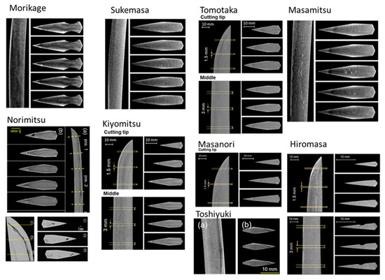 Figure 11 shows CT images of swords other than Noritsuna [28,30,31,33]. White areas occasionally appeared at the corners and surfaces due to beam-hardening and partial volume effects, which are common in CT imaging of metallic materials. Sword images, except for those of Hiromasa, also show black lines near the edges in the longitudinal direction, which indicate quenching area boundaries. For Hiromasa, a line showing the boundary was observed around the tip, and this is consistent with the result of the edge width distribution, where a quenching area was only observed around the tip. In cross-sectional images, quenching boundaries were observed as curved black lines, since there was a temperature gradient along the thickness direction during quenching. However, straight lines were observed for Kiyomitsu, since it has a narrow straight quenching area and a narrow hamon. The images for Kiyomitsu and Toshiyuki show a complicated contrast change. Their crystallite size distributions were also complicated. Images of Sukemasa, Tomotaka, and Masamitsu show smooth contrast, suggesting a monolayer structure. Masanori exhibits a rather smooth contrast change, but a boundary line near the back appears in the center figure of the cross-sections due to quenching from the edge side to the back. In Masamitsu, there are white lines in the longitudinal image and white spots in the cross-section images, which may be due to neutron absorption, but this is not certain. It is indicated that swords with a monolayer structure were present in different places and in the eras of the old swords and the new-new swords. Therefore, this type of sword-making process was probably widely used.