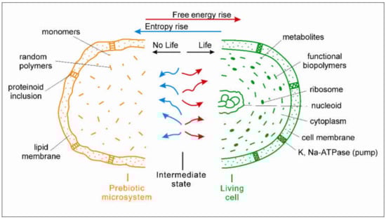The intermediate state between ‘non-life’ and life. Left, yellow—non-living prebiotic microsystem (half) composed of random polymers, monomers, and simple molecules. Center: thermodynamically intermediate state between non-life and life, relative equality of the contributions of chemical reactions producing free energy (red) and entropy (blue). Right, green is the primary living microorganism (half). Its evolutionarily advanced form is shown—a modern prokaryotic cell with basic cellular structures: a nucleoid (circular DNA), ribosomes and a cell membrane [].