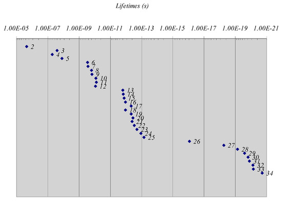The unstable particles with a lifetime greater than the zeptosecond are listed in Table 1; the decays of these particles occur essentially through weak or electromagnetic channels. The plot in Figure 1 shows the representative points of these particles. On the abscissa, the lifetime is reported in seconds, while on the ordinate, no quantity is reported; the vertical axis is introduced only to facilitate the visualization of the spacing of the points.