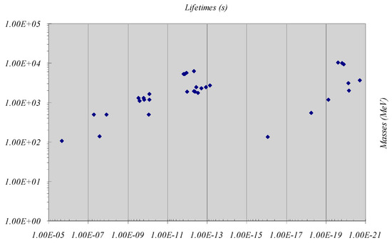 Let us now focus our attention on particle states 2–34 and ask ourselves if it is possible to obtain the mass of a state simply knowing its lifetime. The correlation plot of masses and lifetimes is shown in Figure 2.